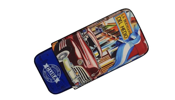 Im Schiebe-Etui im Lederoptik, haben 3 Zigarren unterschiedlichster Formate Platz wie z.B. Grand Corona, Lonsdale oder auch Torpedo. Die Staufächer haben selbst eine Länge von 17cm und einen Durchmesser von 2 cm. Das Zigarrenetui kann aufgrund der stabilen Verarbeitung bis zu einer Länge von 27cm aufgeschoben werden. Beidseitig bedruckt, fühlen sich Ihre Zigarren wie im sonnigen und quirligen Kuba. Ein Muss, nicht nur für Kuba-Fans, sondern auch all jene Aficionado die Freude an ausgefallenen Accessoires haben.