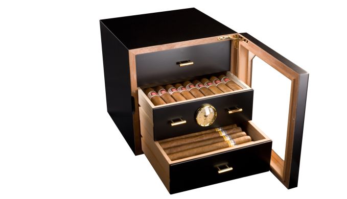 Der Adorini Humidor Chianti Medium - Deluxe ist ein kleiner Humidorschrank mit drei ausziehbaren Schubladen, der genügend Stauraum für bis zu 100 Zigarren bietet. Dem Betrachter fällt der Humidor bereits durch die hochwertige schwarze Mehrfachlackierung ins Auge. Mit einer praktischen Glastür versehen, kann man von außen den Haarhygrometer ablesen, ohne den Humidor öffnen zu müssen. Im Inneren wurde spanisches Zedernholz verarbeitet. Bei diesem Modell überzeugt exzellente Produktqualität, schöne Verarbeitung und ein hervorragendes Preis-Leistungs-Verhältnis.