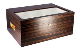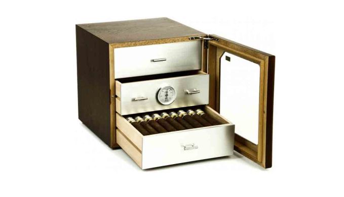 Der Adorini Chianti M Walnut ist ein formschöner, kubischer Humidor mit Walnussfurnier. Die Vorderseite ist eine Glastür, welche den Blick auf die drei Schubladen mit gebürsteter Aluoptik frei gibt. Der Humidor wird mit dem bewährten Befeuchtungssystem von Adorini befeuchtet, einem Acryl Polymer Befeuchter. In der zweiten Schublade wurde ein Haarhygrometer eingebaut, der die optimale Feuchte des Humidor immer anzeigt.