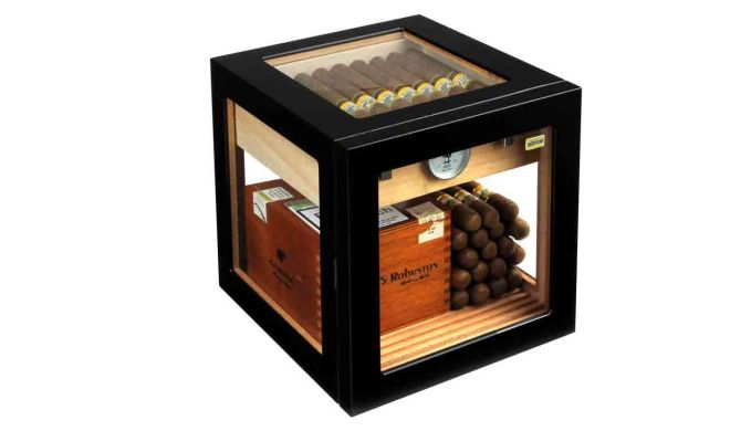 Der kubische Humidor ist von allen Seiten einsehbar. Die Oberfläche des schwarzen Humidors besteht aus mehreren Lackschichten mit matter Optik. Die Kantenlänge des Humidors in Würfelform beträgt 24 cm.