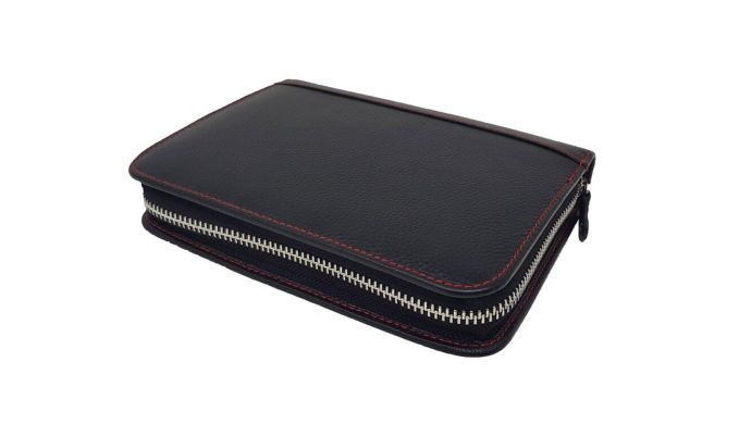Aus echtem Leder mit rotem Garn abgesteppt, ist die Zigarrentasche nicht nur modisch eine Blickfang. Mit praktischem Reißverschluss und im handlichen A5 Format hat die Zigarrentasche alles, was Sie für den Transport Ihrer Rauchutensilien benötigen. Die großzügige Taschenaufteilung bietet Ihnen neben einem Zigarrenfach für 5-7 Zigarren auch zusätzliche Fächer für Jetflame, Cutter, Kreditkarte und Stift. Das 16x13cm große Zigarrenfach kann durch Magnete höhenverstellbar verschlossen werden und bietet auch Zigarren in unterschiedlichen Formaten ausreichend Schutz.