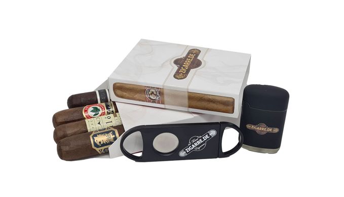 Zusätzlich liegt dem Sampler ein hochwertiges zigarre.de Jetflame und ein zigarre.de Guillotinen-Cutter, 100% made in Solingen bei.