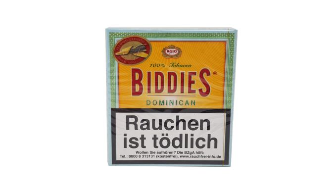Die Biddies Dominican Zigarillos sind mit 84 mm Länge und einem Durchmesser von 7mm schlank. Ein 100iger dominikanischer Olor-Tabak und ein Java-Deckblatt verleihen dem eleganten Zigarillo einen kräftig-dominikanischen Rauchgenuss. Ohne jegliche Schärfe, begleiten vorwiegend erdig-toastige Aromen den unproblematischen Rauchgenuss und verzaubern mit tropenfrischen süßlichen Nuancen.