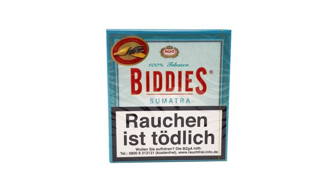 Die Biddies Sumatra sind mit 84 mm Länge und einem Durchmesser von 7mm schlank und elegant. Ein Sumatra-Deckblatt macht die Biddies Sumatra authentisch im Geschmack. Eine leichte Süße, begleiten die vorwiegend torfig-holzigen Aromen. Im Rauchverlauf ist eine süßlich-herbe Fruchtnote spürbar. Der edle Geschmack des 100% Tabaks macht die Biddies Sumatra zu einer erstklassigen Sorte, die mit Würze das vollmundige Raucherlebnis prägt.