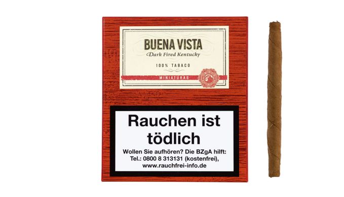 Aus dem Hause Buena Vista weht eine neue aufregende Tabak-Komposition. Der Tabak für die Buena Vista Fired Kentucky Zigarillos wird über schwelendem Eichen-und Hickoryholz getrocknet. Durch diese schonende und traditionelle Rauch-Trocknung erhält der Tabak ein einzigartiges Aroma, welches jedem Zigarillo einen wunderbar rauchigen Charakter gibt. Im Miniatura-Format präsentiert sich der Buena Vista Dark Fired Kentucky mit einem feinwürzigen Geschmack, bei leichter Röstnote. In der Einlage finden sich beste Tabake aus Peru, der Dominikanischen Republik und Nicaragua. Ein mexikanisches Sumatra Umblatt und ein Connecticut Seed aus Ecuador veredeln diesen Shortfiller, der zu den kleinsten seiner Serie gehört. Im mittleren Stärkebereich, sorgt der Buena Vista Dark Fired Kentucky Miniaturas für einen kurzen und angenehmen Rauchgenuss.