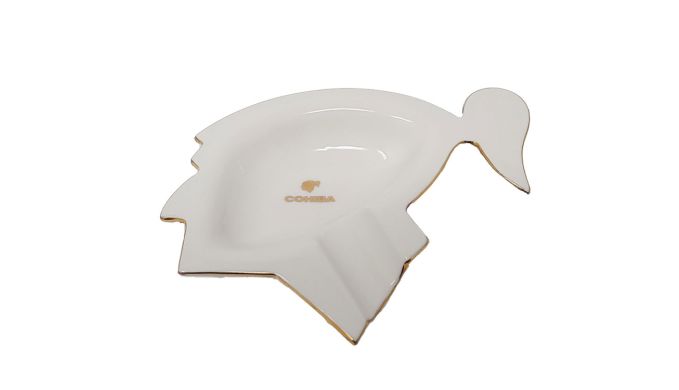 Die Bezeichnung Cohiba stammt aus der Alltagssprache der Taíno-Indianer und bezeichnet einen Wickel aus Tabakblättern, den die Ureinwohner rauchten. Angelehnt an dieses historisches Ritual, zeigt das Logo der Zigarrenmarke den Kopf des Taino-Indianers Hatuey. Der weiss glasierte Keramik-Aschenbecher ist ebenfalls diesem Indianerkopf gestaltet und wurde per Hand mit einem feinen Goldrand verziert. Mit einer maximalen Breite von ca. 18cm und einer Höhe von 2cm bietet der Cohiba Aschenbecher eine interessante Ablagemöglichkeit für eine Zigarre. Ideal als Geschenk oder als Raumaccessoire, das besonders ins Auge fällt.