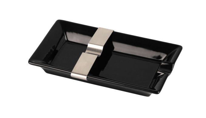 Im hochglanzlackierten Keramik präsentiert sich der Single-Aschenbecher und besticht durch eine zeitlose Eleganz. Zusätzlich ist ein abnehmbarer Metallhalter angebracht, der auch größere Zigarrenformate während der Ablage zusätzlich unterstützt. Mit dem Maßen 20,3cm Breite, 12cm Tiefe und 3cm Höhe findet dieser klassische Aschenbecher seinen Platz und passt zu jedem Interieur.