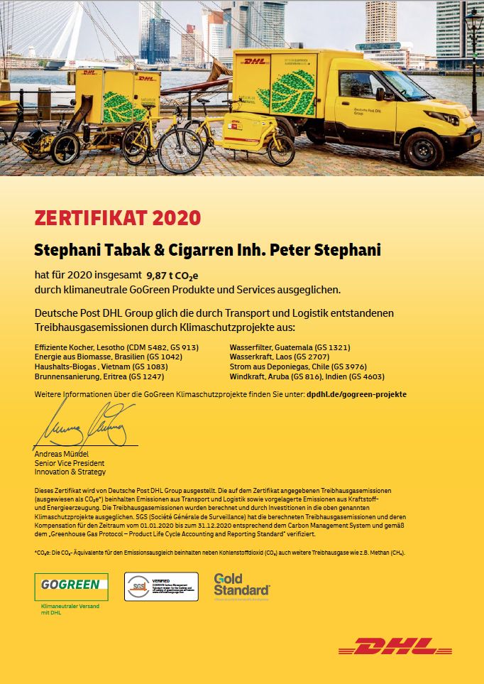 Durch das Programm GOGREEN hat Zigarre.de im Jahr 2020 insgesamt 9,87 t CO2e durch klimaneutrale GoGreen Produkte und Services ausgeglichen (Zertifikat herunterladen).
