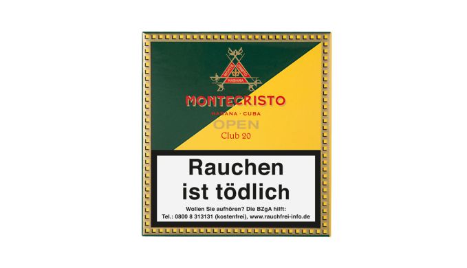 Die Anlehnung an das Schwestern-Format, zeigt sich auch im Design der Verpackung. Die Faltschachtel der Montecristo Open Club 20, ist in gleichem grün-gelb gehalten, wie das Schwestern-Format.