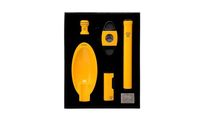 Dieses stilvolle 5-teilige Geschenkset enthält alle notwendigen Utensilien, die ein Aficionado braucht. Jeder Artikel ist in einem auffälligen Gelb mit schwarzen Akzenten erhältlich. Das Set besteht aus: