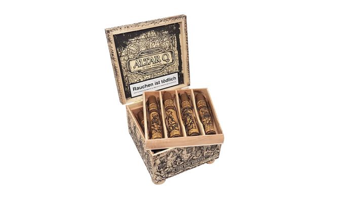Jede Zigarre liegt eingebettet in einer 4fach unterteilten Ablage. Die angebrachten Banderolen zeigen großflächig jeweils einen der 16 regierenden Herrscher. Eine zusätzliche Banderole am Fuß der Zigarre verweist auf dessen Namen. Besonders eindrucksvoll ist auch der Zopf am Kopf der Zigarre. Ein seidiges Sumatra Deckblatt aus Ecuador, Umblatt und Einlagetabake aus der Copán Region bilden eine exquisite Aromenkomposition aus Orange, Leder, Holz und Nuss. Zu Beginn startet die Altar Q Toro sacht mit cremig-süßen Aromen, die mit einer Nuance von Pfeffer begleitet werden. Auf einer Länge von 152 mm nimmt die Intensität der nussigen Aromen zu, wobei sich erdig-grasige Noten mit dem Geschmack von dunkler Schokolade und Honig vereinen.