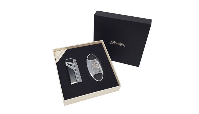 Mit dem in der Geschenkbox gelieferten Cutter der Firma Passatore können Zigarren mit bis zu einem Durchmesser von 8 mm fachgerecht und präzise angeschnitten werden. Der Cutter selbst hat eine Länge von 9,2 cm, eine Breite von 4,3 cm und ist mit 0,7 cm sehr flach. Das 3-flammige Jetflame ist passend zum Cutter in glänzendem Chrom gehalten und wirkt mit dezenten schwarzen Details besonders elegant. Für das perfekte Anzünden sorgen integrierte Luftschlitze, die für einen gleichmäßigen Luftstrom sorgen. Ein Klappdeckel schützt zusätzlich die Düsen vor Staub und Schmutz. Mit den Maßen H 7,5 cm, B 3,3 cm und einer Tiefe von 1,8 cm liegt das Jetflame ideal in der Hand. Ein wunderschönes Präsent für alle Zigarrenliebhaber, nicht nur zur Weihnachtszeit.