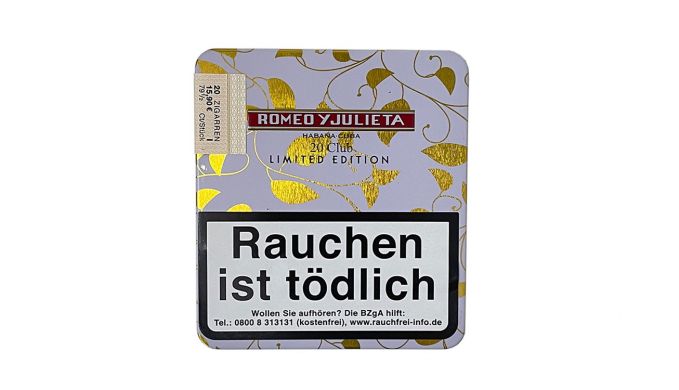 Neu in limitierter Auflage präsentieren sich die Romeo y Julieta Club Zigarillos in einer Blechverpackung zu je 20 Stück. Die Romeo y Julieta Club ist die cremigste Zigarillo der kubanischen Marke. Sie ist von mildem Charakter und aus besten kubanischen Tabaken in hervorragender Qualität gefertigt.