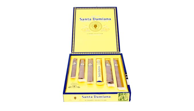 Die Santa Damiana 6 Cigars Collection bietet eine auserlesene Auswahl der beliebtesten Zigarren. Die Marke Santa Damiana existiert seit 1992 und hat mit ihren nicht zu kräftigen cremigen Zigarren schnell weltweit den Markt erobert. Die 6 Cigars Selection bietet einen guten Überblick über die Zigarrenvielfalt der Marke. Angefangen bei der Panatela bis zum größten Format, der Churchill. Enthalten sind die Santa Damiana Panatela, die Robusto, die Corona eine Tubulares Extra im gelben Aluminiumtubos, die Torpedo und schließlich die Churchill. Alle Zigarren sind, wie für die Marke typisch, leicht bis mittelkräftig, mit angenehmer Würze und cremigem Rauch und somit für Einsteiger und auch für erfahrene Aficionados geeignet. Die elegante gelb blaue Holzkiste macht als Geschenk eine hervorragende Figur und für alle Aficionados eine gute Wahl.