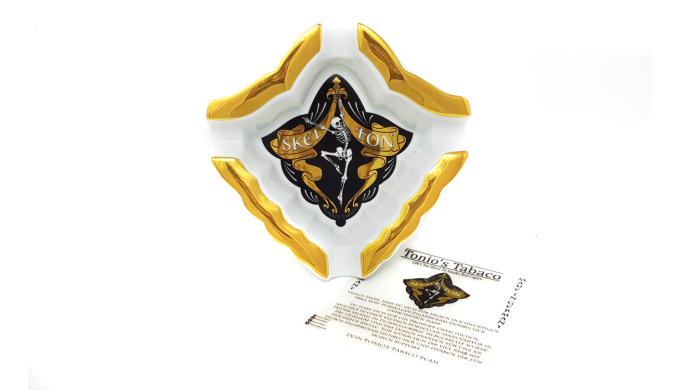 Live Your Dreams - getreu dem Motto Tonio Neugebauer`s, der mit seinem Unternehmen Tonio’s Tabaco seine Leidenschaft für gute Zigarren beweist, prägt diese Einstellung auch das Design des stylischen Aschenbechers. Hergestellt in einer kleinen Porzellan-Manufaktur im Fichtelgebirge ist dieses Accessoire made in Germany. Hochwertiges Porzellan, mit goldverzierten Rändern und ein großformatiges Motiv des mittlerweile bekanntesten Skelett`s in der Branche, zieht dieser Aschenbecher alle Blicke auf sich. Mit knapp 23cm x 23cm und einer Tiefe von 5cm bietet dieser Aschenbecher genügend Platz für bis zu 4 Zigarren. An der Unterseite des Aschenbechers befinden sich 4 weiche Fleecepunkte, die das Beschädigen von Tisch- oder Kommodenoberflächen verhindert.