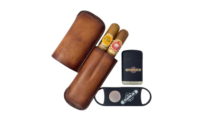 - 1x H. Upmann Connossieur No. 2 - 1x Quai D’Orsay No. 50 - 1x zigarre.de Robusto Etui für zwei Zigarren in der Farbe „Cognac“ - 1x zigarre.de Jetflame - 1x zigarre.de Cutter