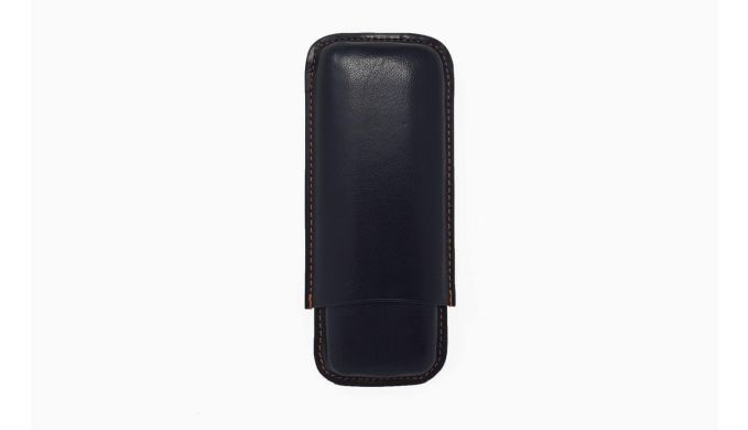 In schwarzer Lederoptik, edel mit brauner Ziernaht abgesteppt, bietet der praktische Schieber Platz für 2 Zigarren im Robusto Format.
