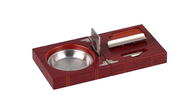 Unser Zigarrenset Rosewood enthält einen Aschenbecher mit 8 cm großer Auffangschale. Durch einen unsichtbaren starken Magneten ist es gleichgültig, in welcher Position Sie Ihre Holzbox öffnen. Der Aschenbecher bleibt an seinen Platz und fällt Ihnen beim Öffnen nicht entgegen. Auf der Accessoire Seite finden Sie neben dem Bohrer einen Cutter. Diesen können Sie in die vorgesehene Mulde neben dem Aschenbecher senkrecht einstecken und den Effekt einer Guillotine erzielen. Die staunenden und neugierigen Blicke der Menschen in Ihrem Umfeld sei Ihnen gewiss.